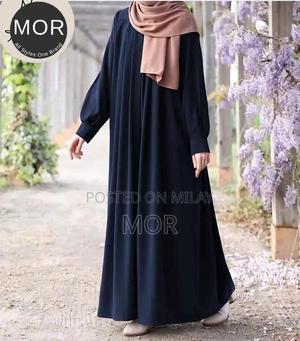 Contemporary blue abaya with comfortable fit, featuring 24/25 chest size and full 50/51 length. Elegant 100 flare design provides graceful movement and stylish silhouette for various occasions.
