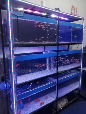 Complete aquarium rack system featuring 7 aquariums in various sizes. Includes 5 and 2 . Rack measures 5.5ft in length. Aquariums in good condition with included lighting.