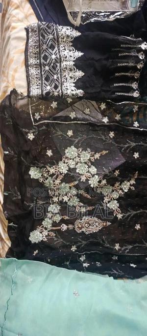Sophisticated black dress featuring intricate aqua and silver embroidery. Delicate craftsmanship highlights the dress's unique design, making it perfect for special occasions and formal events.