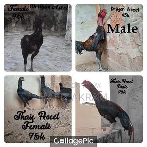 High-quality Aseel chickens available for breeding. Includes Dragon Aseel and Thaie Aseel varieties. Male and female specimens perfect for poultry enthusiasts and professional breeders seeking premium bloodlines.