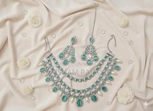 Complete Walima bridal jewelry set featuring white base with intricate 1K stone work. Includes choker, earrings, and bindi. Available in pink and light green shades. Perfect for wedding and party wear.