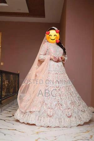 Elegant bridal maxie in beige net fabric featuring intricate dabki, sitari, nageena, and pearl resham embroideries. Fully stitched with CanCan attachment and included pouch. Size small to medium, worn only once.