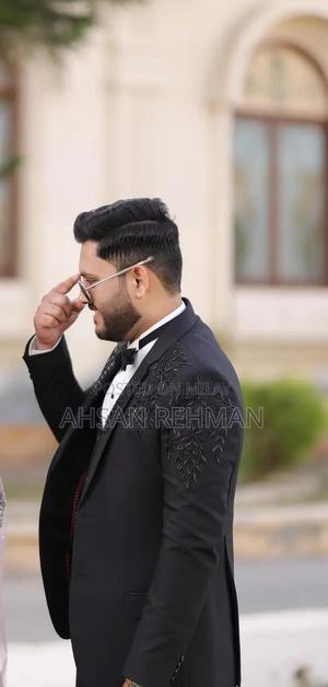 Elegant black tuxedo complete set, professionally tailored for a sophisticated look. Includes coat, pants, waistcoat, and white shirt with black bow tie. Gently used, perfect for special events like weddings or formal ceremonies.